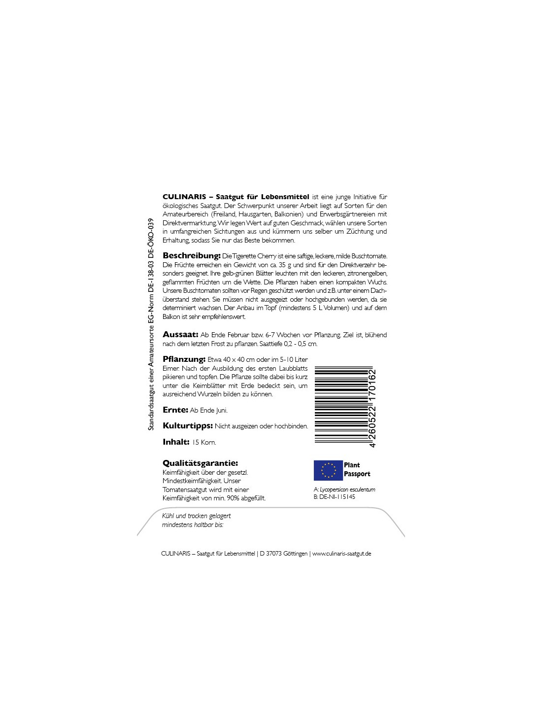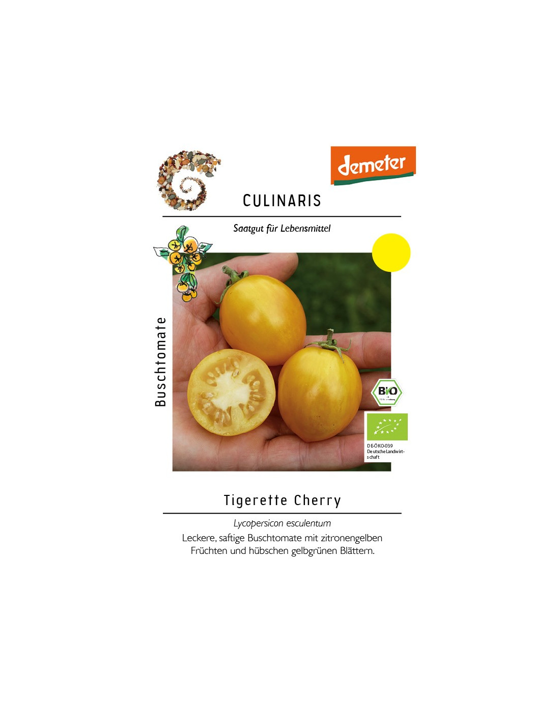 Die Tigerette Cherry ist eine saftige, leckere, milde Buschtomate. Die Früchte erreichen ein Gewicht von circa 35 g und sind für den Direktverzehr besonders geeignet. Ihre gelb-grünen Blätter leuchten mit den leckeren, zitronengelben Früchten um die Wette. Die Pflanzen haben einen kompakten Wuchs. Unsere Buschtomaten sollten vor Regen geschützt werden und z.B. unter einem Dachüberstand stehen. Sie müssen nicht ausgegeizt oder hochgebunden werden, da sie determiniert wachsen. Der Anbau im Topf (mindestens 5 L Volumen) und auf dem Balkon ist sehr empfehlenswert.