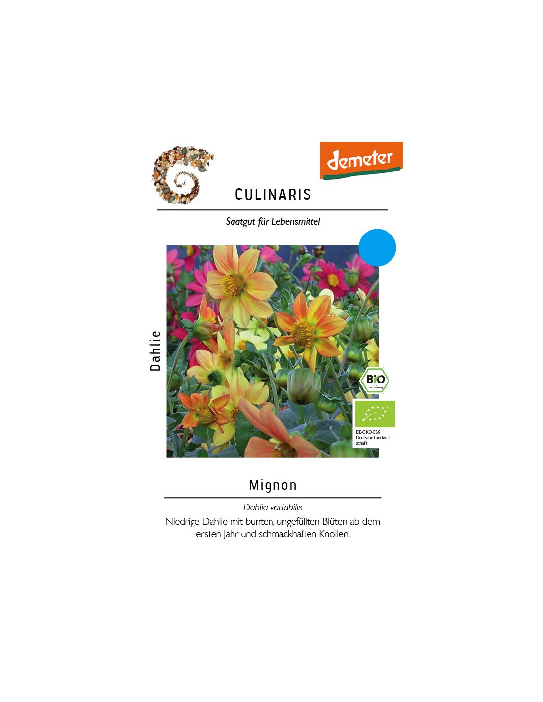 Die Dahlie Mignon ist eine kleinbleibende Sorte (bis ca. 50 cm hoch). Sie bereichert den Garten mit einer bunten Farbmischung ungefüllter Blüten und setzt Akzente in weiß, gelb, lachs, orange, rosa, hell- und dunkelrot. Sie blüht ab dem ersten Jahr und kann einfach (frostfrei) überwintert werden. Bei einer frühen Anzucht hat sie eine sehr lange Blütezeit. Der Anbau in Topf und Kübel funktioniert hervorragend. Ungefüllte Blüten haben in der Regel deutlich mehr Nektar, sind eine tolle Bienenweide und haben deshalb einen höheren Stellenwert für die Biodiversität als gefüllte Blüten. Dahlie als Gemüse: Blütenblätter, aber auch die gesamte Dahlienknolle sind essbar! Die Knollen sind stärkehaltig, gesund und bringen ein tolles würziges Aroma mit – probieren Sie es aus!