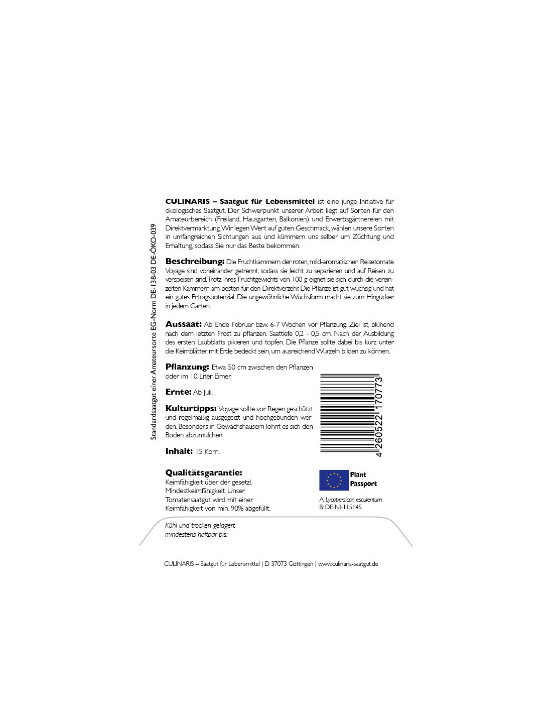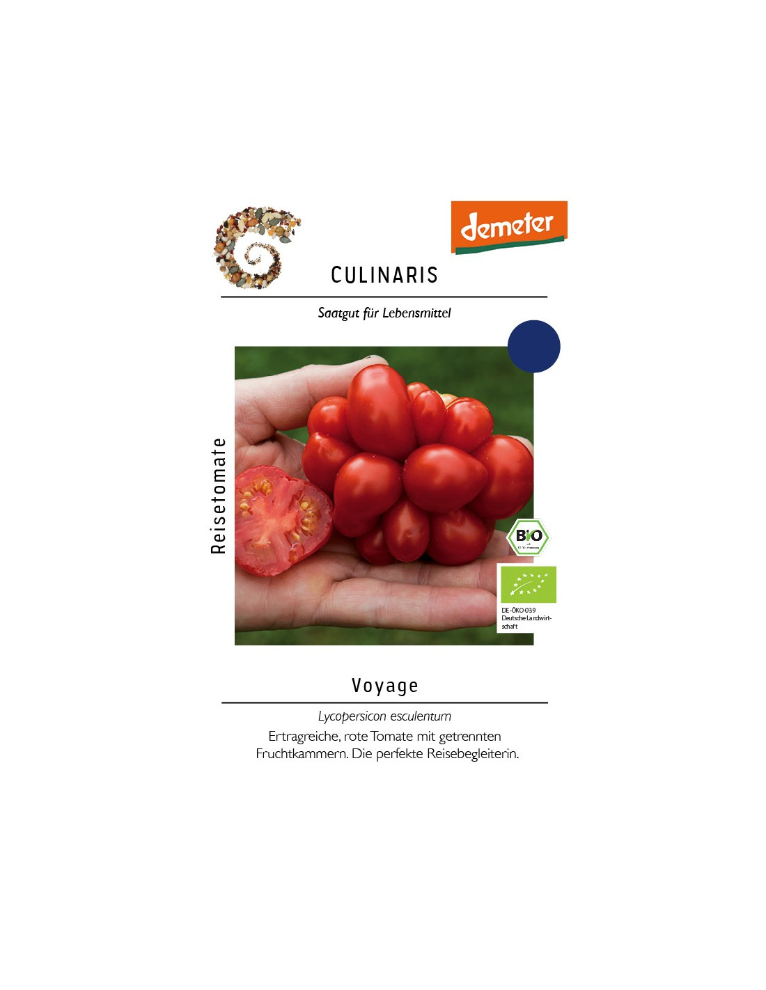 Die Fruchtkammern der roten, mild-aromatischen Reisetomate Voyage sind voneinander getrennt, sodass sie leicht zu separieren und auf Reisen zu verspeisen sind. Trotz ihres Fruchtgewichts von 100 g eignet sie sich durch die vereinzelten Kammern am besten für den Direktverzehr. Die Pflanze ist gut wüchsig und hat ein gutes Ertragspotenzial. Die ungewöhnliche Wuchsform macht sie zum Hingucker in jedem Garten. Die Reisetomate sollte geschützt unter einem Dachüberstand oder im Gewächshaus angebaut werden. Die Pflanze sollte man regelmäßig ausgeizen und aufbinden. Eine ausreichende Nährstoffversorgung erhöht den Ertrag.