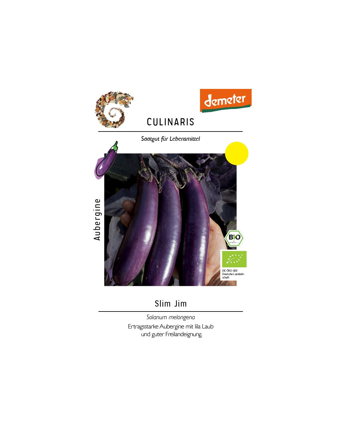 Slim Jim überzeugt unter extensiven Bedingungen mit hohen Erträgen ab dem Hochsommer. Die aufrechte, üppig belaubte Sorte hat zahlreiche längliche lila Früchte, welche in Trauben wachsen. Die Früchte erreichen Größen um ca. 15 cm und haben ein durchschnittliches Gewicht von etwa 100 g. Slim Jim hat einen hervorragenden intensiven Auberginengeschmack und ist nicht bitter. Die Reife ist mittelspät und ausdauernd. Neben den Früchten haben auch die Blätter eine violette Färbung, was Slim Jim zu einem echten Hingucker macht. Die Sorte ist sehr gesund und lässt sich neben dem Anbau im Freiland auch wunderbar im Kübel bzw. auf dem Balkon kultivieren.