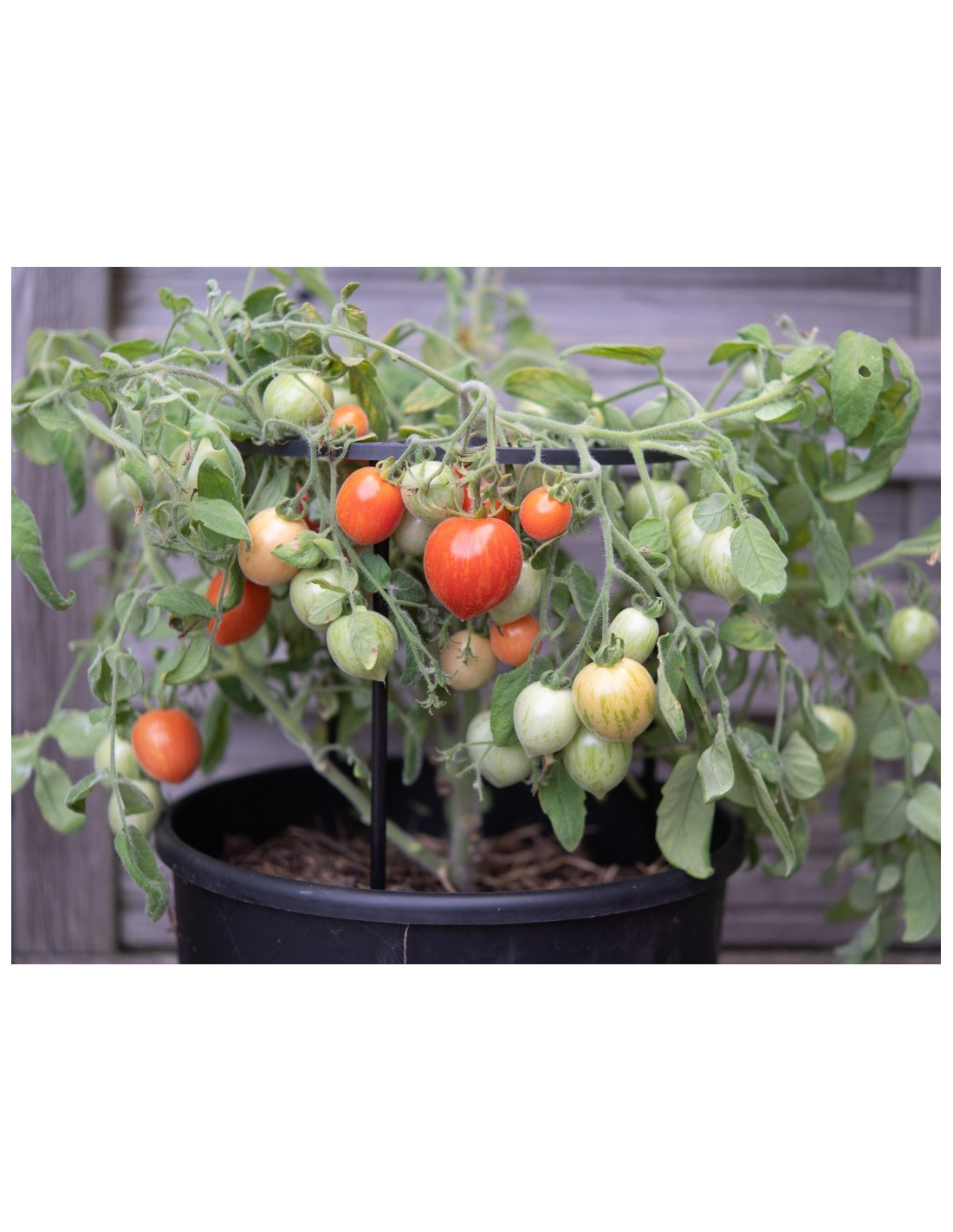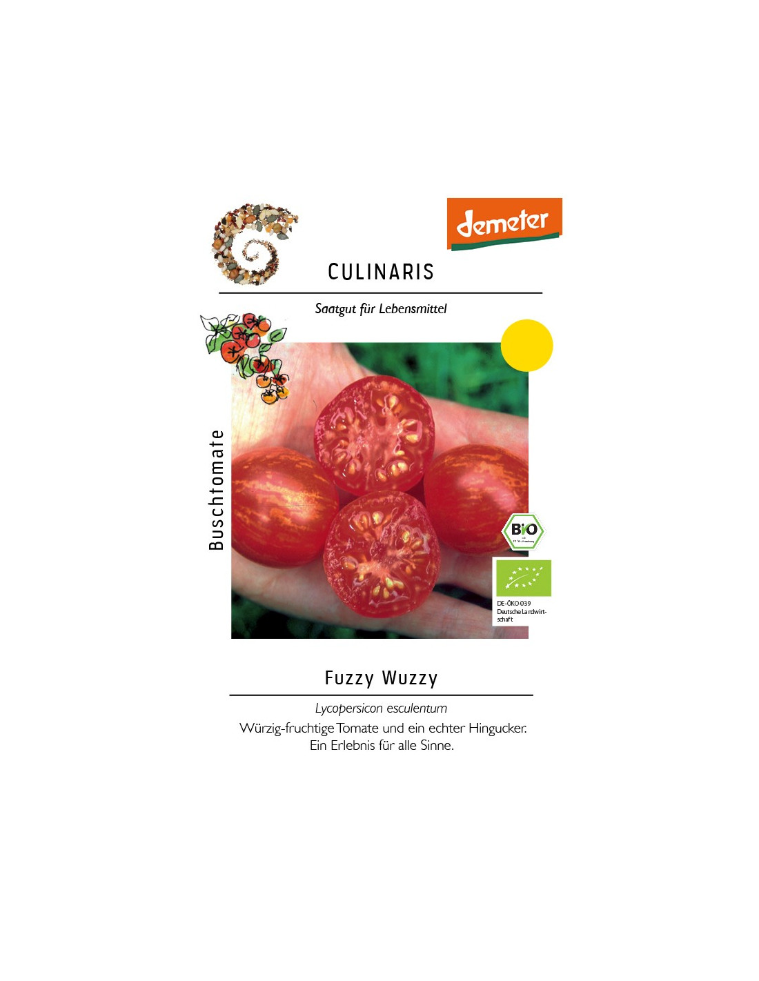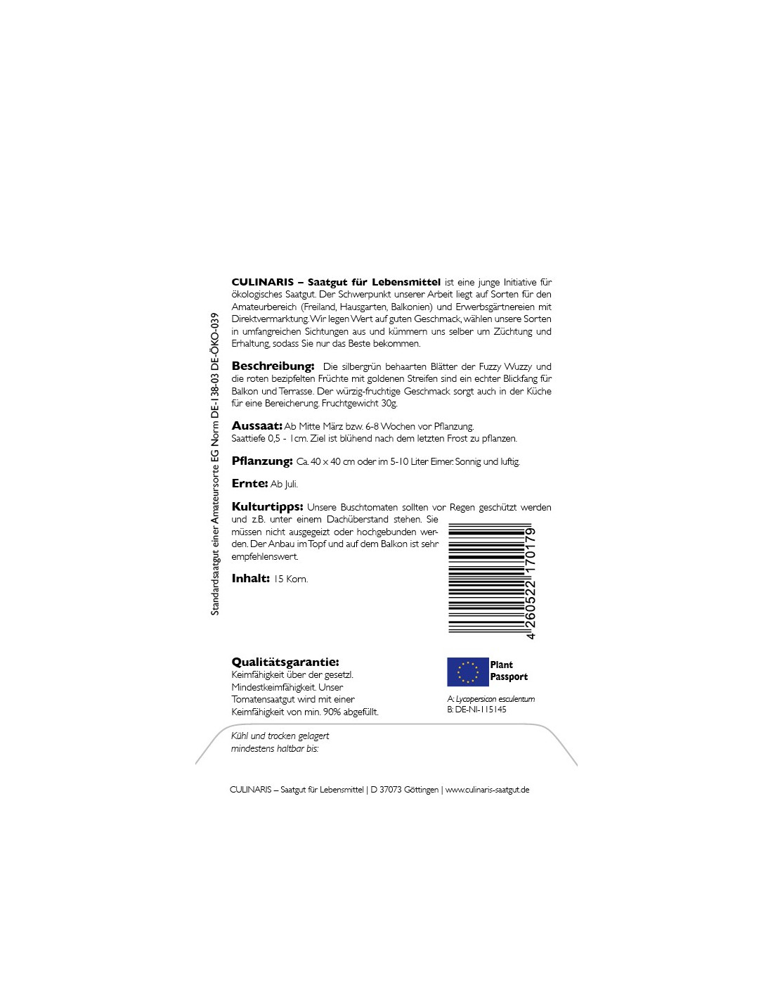 Die Buschtomate Fuzzy Wuzzy hat rote, bezipfelte Früchte mit goldenen Streifen und einem würzig-fruchtigen Geschmack, der in der Küche für eine Bereicherung sorgt. Mit einem Fruchtgewicht von 30 g ist der Direktverzehr empfehlenswert. Gemeinsam mit den silbergrün behaarten Blättern sind die außergewöhnlichen Früchte ein echter Blickfang für Balkon und Terrasse. Unsere Buschtomaten sollten vor Regen geschützt werden und z.B. unter einem Dachüberstand stehen. Sie müssen nicht ausgegeizt oder hochgebunden werden, da sie determiniert wachsen. Der Anbau im Topf (mindestens 5 L Volumen) und auf dem Balkon ist sehr empfehlenswert.
