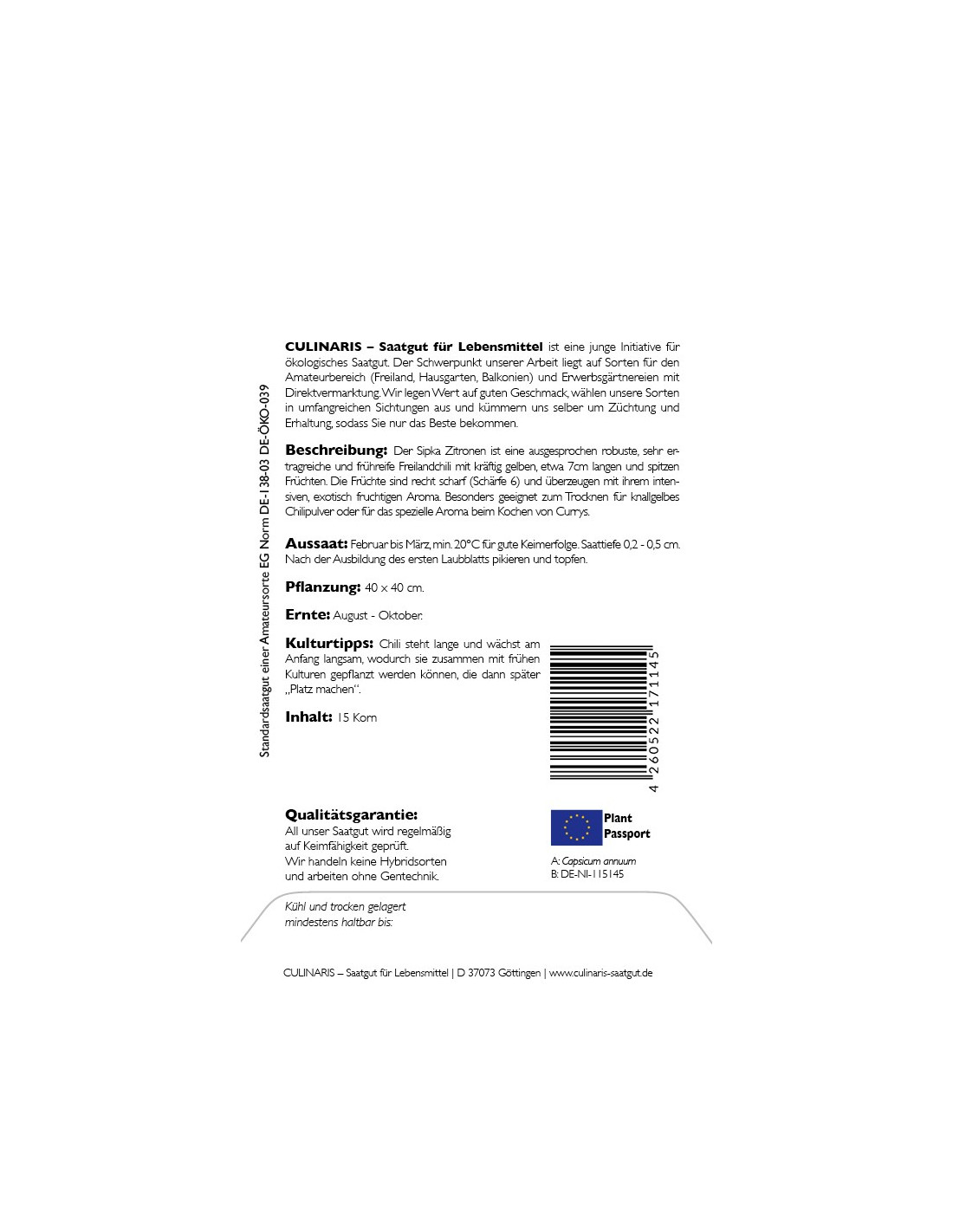 Der Sipka Zitronen ist ein ausgesprochen robuster, sehr ertragreicher und frühreifer Freilandchili mit kräftig gelben, etwa 7cm langen und spitzen Früchten. Die Früchte sind recht scharf (Schärfe 6) und überzeugen mit ihrem intensiven, exotisch fruchtigen Aroma. Besonders geeignet zum Trocknen für knallgelbes Chilipulver oder für das spezielle Aroma beim Kochen von Currys.
