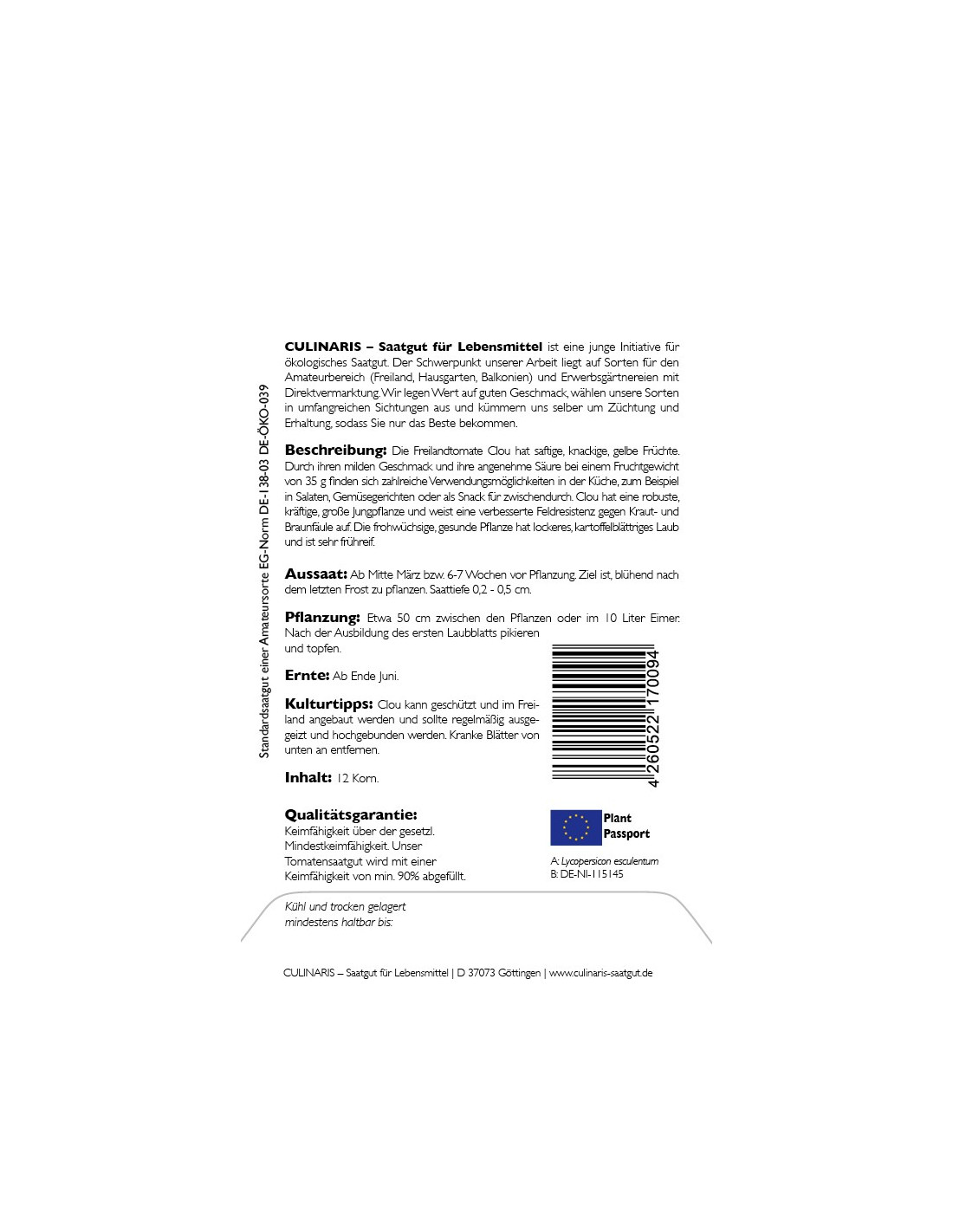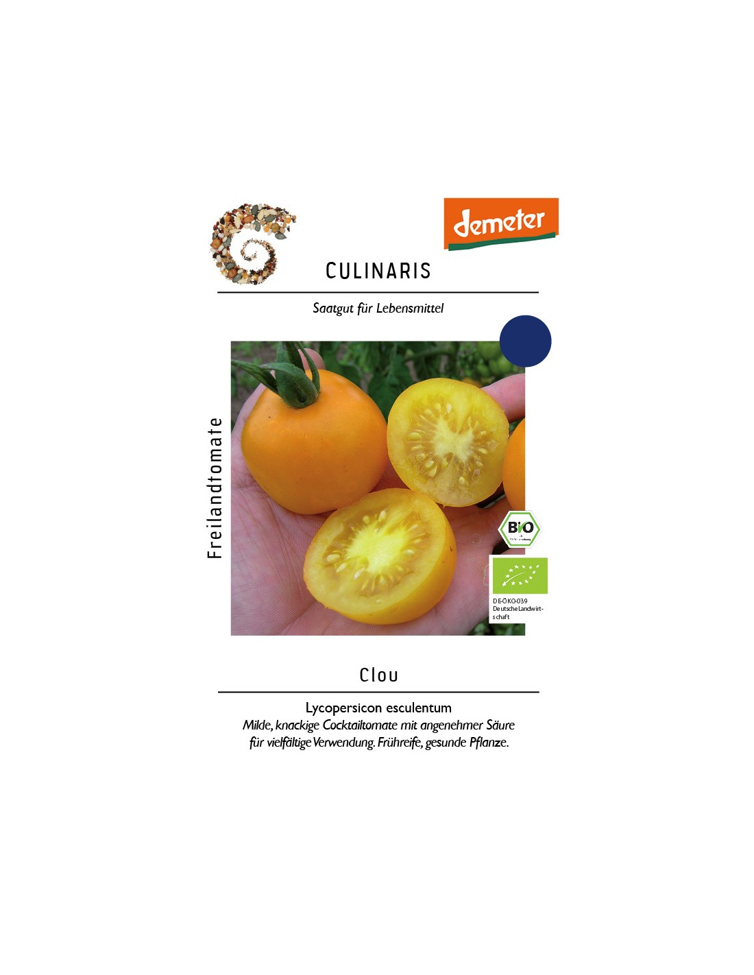 Die Freilandtomate Clou hat saftige, knackige, gelbe Früchte. Durch ihren milden Geschmack und ihre angenehme Säure bei einem Fruchtgewicht von 35 g finden sich zahlreiche Verwendungsmöglichkeiten in der Küche, zum Beispiel in Salaten, Gemüsegerichten oder als Snack für zwischendurch. Clou hat eine robuste, kräftige, große Jungpflanze und weist eine verbesserte Feldresistenz gegen Kraut- und Braunfäule auf. Die frohwüchsige, gesunde Pflanze hat lockeres, kartoffelblättriges Laub und ist sehr frühreif. Freilandtomaten können ungeschützt im Freiland angebaut werden. Man sollte sie regelmäßig ausgeizen und hochbinden. Eine ausreichende Nährstoffversorgung erhöht den Ertrag, aber Clou ist auch bei reduzierter Düngung und Bewässerung leistungsfähig.