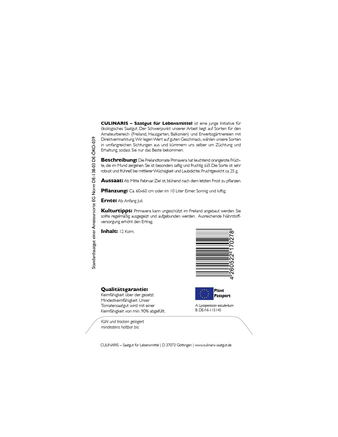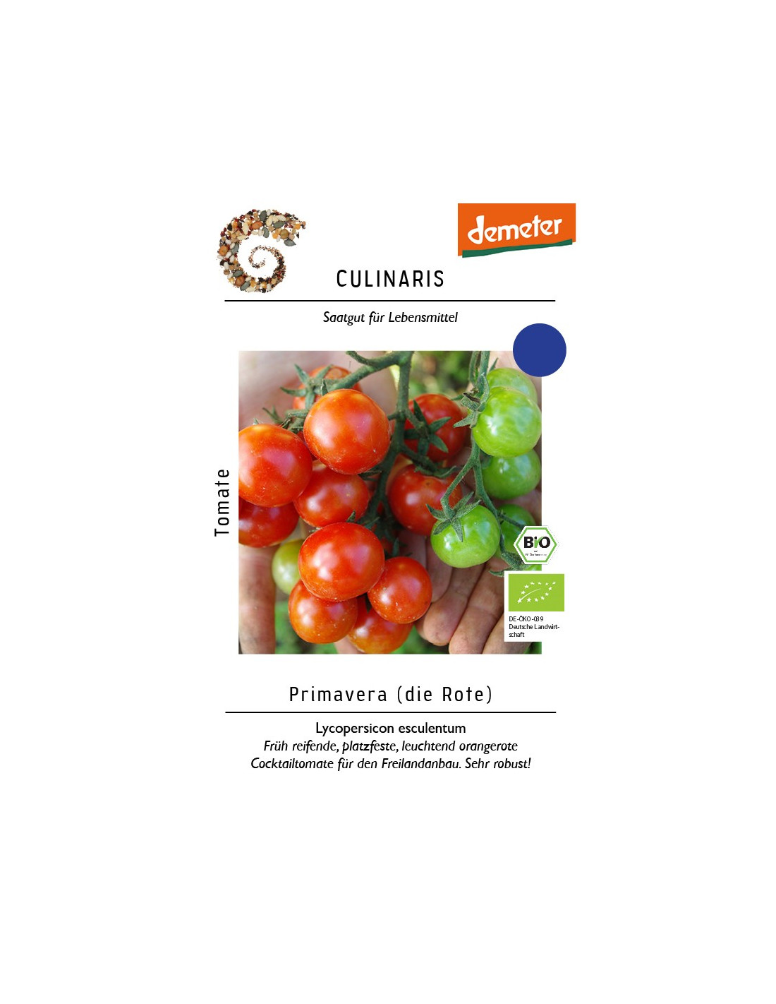 Die frühreife und ertragsstarke Freilandtomate Primavera hat leuchtend orangerote, saftige Früchte, die im Mund zergehen. Mit ihrer fruchtigen Süße und einem Fruchtgewicht von 25 g eignen sie sich für den Direktverzehr, zum Garnieren von Salaten und in Gemüsegerichten. Mit Olivenöl, Rosmarin und Salz schmecken sie auch als Ofengemüse sehr gut. Primavera hat eine robuste, kräftige, kompakte Jungpflanze mit einer mittleren Wüchsigkeit und Laubdichte und weist eine verbesserte Feldresistenz gegen Kraut- und Braunfäule auf. Die etwas längere und offenere Pflanze ist besonders für den ungeschützten Freilandanbau und für den Anbau im Kübel geeignet. Man sollte sie regelmäßig ausgeizen und hochbinden. Eine ausreichende Nährstoffversorgung erhöht den Ertrag, aber Primavera ist auch bei reduzierter Düngung und Bewässerung leistungsfähig.