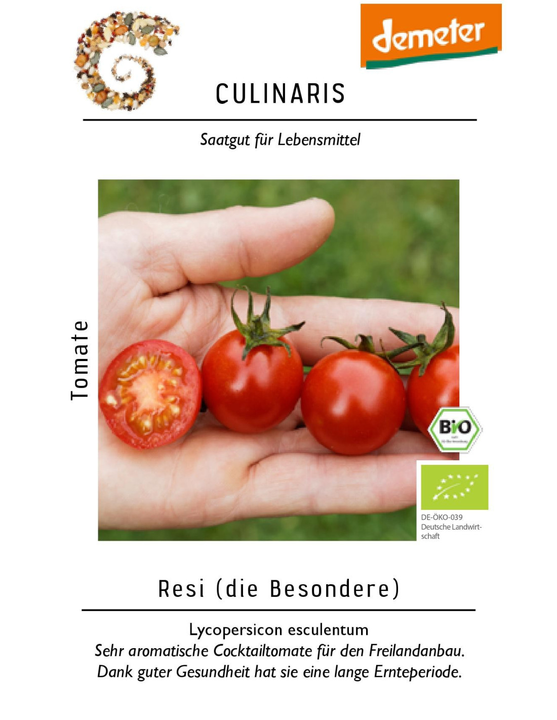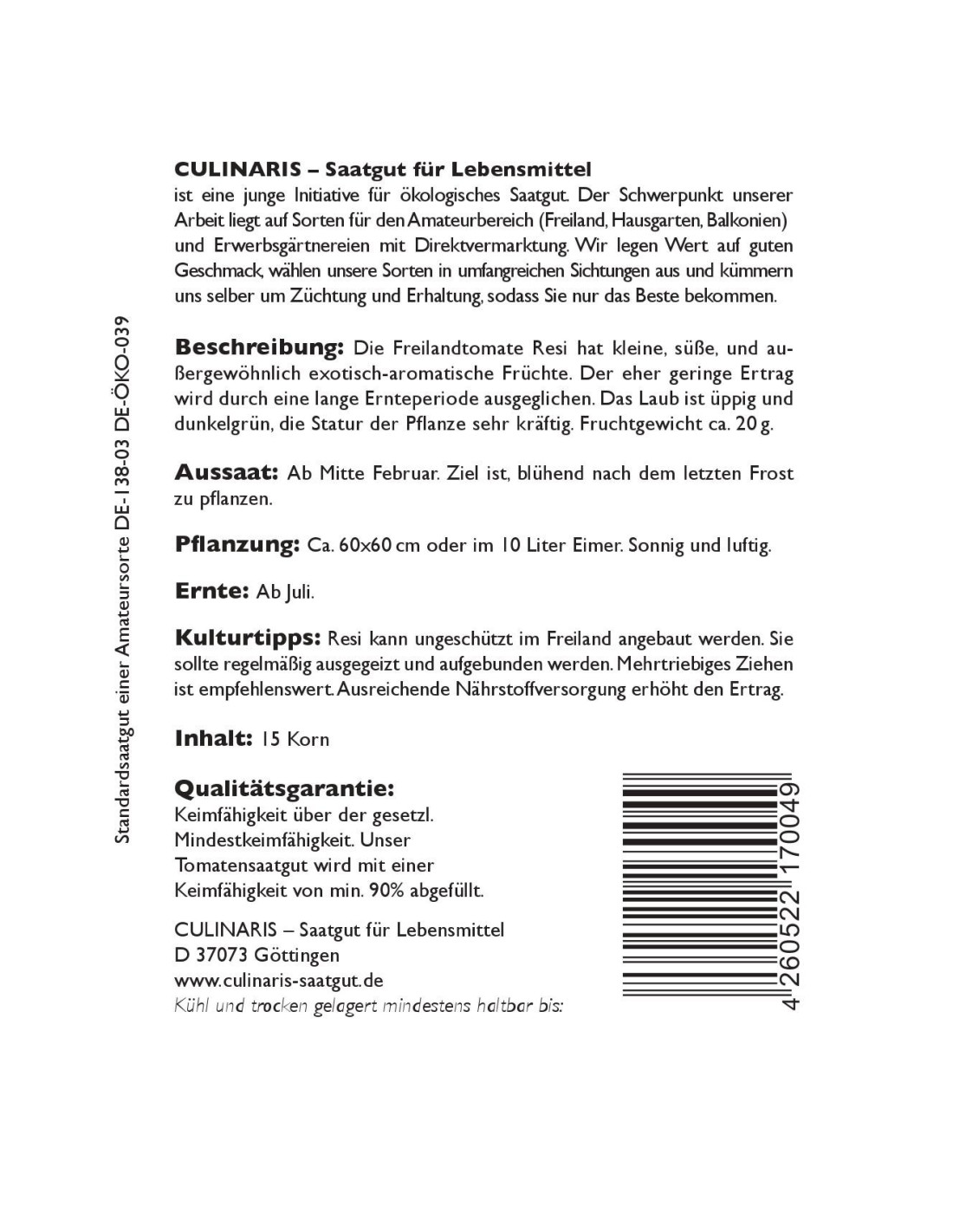 Die Freilandtomate Resi hat kleine, dunkelrote, süße und außergewöhnlich exotisch-aromatische Früchte mit Nuancen von Banane und Ananas. Mit ihrem Fruchtgewicht von 20 g eignet sie sich besonders für den Frischverzehr und als Geschmackserlebnis in Salaten. Der eher geringe Ertrag wird durch eine lange Ernteperiode ausgeglichen. Resi hat eine dunkelgrüne, schlanke Pflanze mit kräftigem Wuchs und einer hohen Braunfäuletoleranz. Durch die enganliegenden Blätter ist wenig Standraum nötig. Eine Engpflanzung wie auch Topfkultur sind gut durchführbar. Durch den starken Wuchs ist auch ein mehrtriebiger Anbau erfolgversprechend und wird unter Dach empfohlen. Der Anbau ist im ungeschützten Freiland, im Tunnel oder Gewächshaus und auch gut in der Containerkultur möglich.