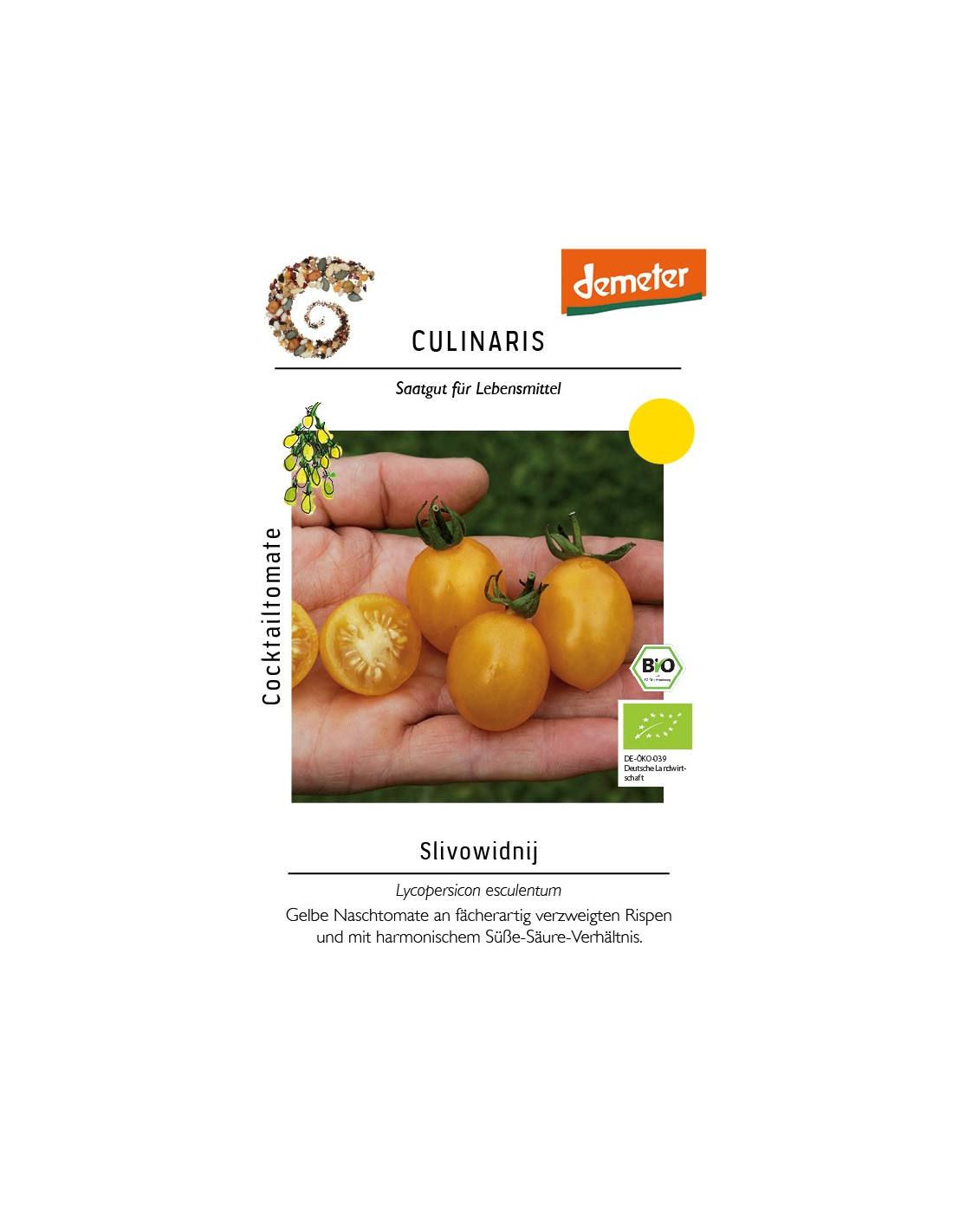 Die frohwüchsige Slivowidnij beschert an fächerartig verzweigten Blütenständen massenhaft ovale, gelbe Naschtomaten mit einem ausgewogenem Süße-Säure-Verhältnis. Mit einem Fruchtgewicht von 10 g ist die Tomate sehr gut für den Direktverzehr geeignet. Sliwowidnij sollte regelmäßig ausgegeizt und hochgebunden werden. Eine ausreichende Nährstoffversorgung erhöht den Ertrag. Auch im Herbst überzeugt Sliwowidnij noch mit gutem Geschmack und Ertrag. Vor dem Frost können ganze Fruchtstände zum Nachreifen geschützt aufgehängt werden. Unsere historischen Sorten wurden im "überdachten Feldanbau" bei niedrigem Düngeniveau und ohne zusätzliche Bewässerung auf Leistungsfähigkeit, Gesundheit und Geschmack selektiert.
