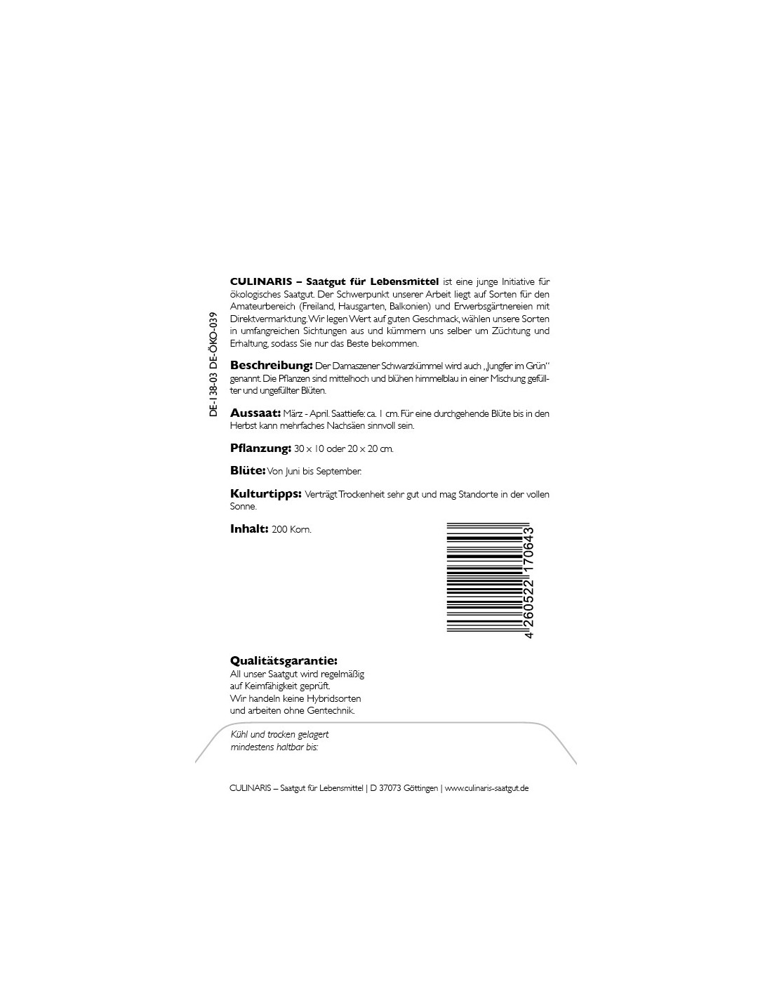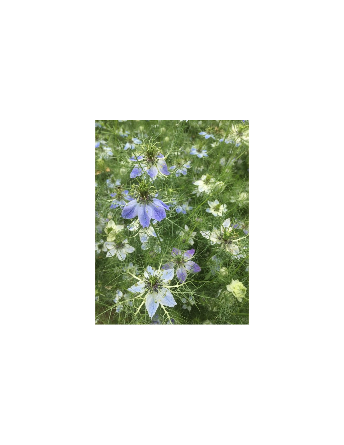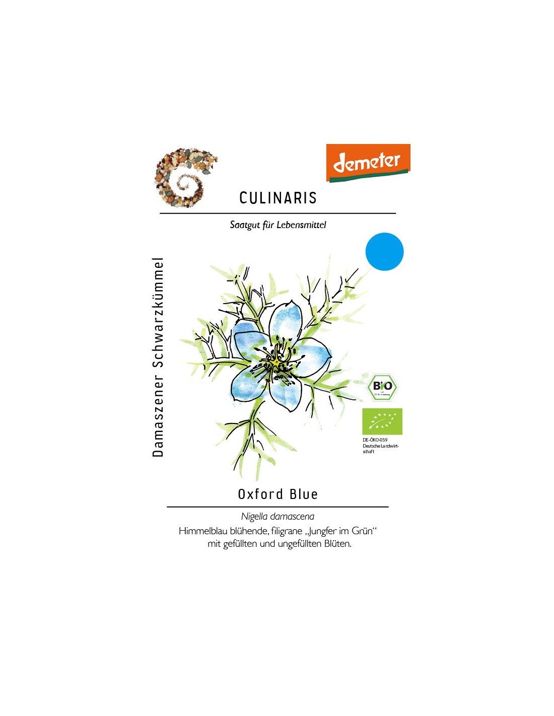 Der Damaszener Schwarzkümmel wird auch „Jungfer im Grünen“ genannt. Die Pflanzen der Sorte Oxford Blue sind zart, filigran und werden bis etwa 50 cm hoch. Sie blühen in einem Farbspiel von weiß-hellblau bis dunkelblau-lila. Ihre Blüten sind wirklich beeindruckend und werden intensiv von Insekten angeflogen!