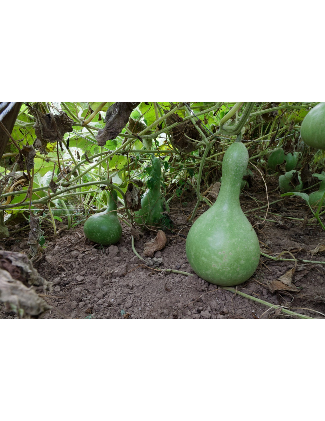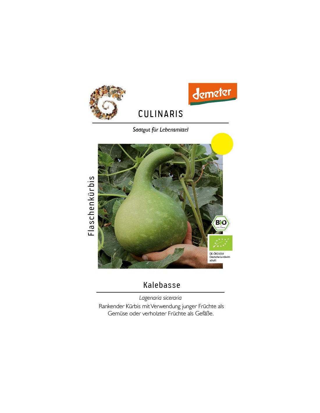 Die Kalebasse ist ein rankendes Gewächs, das eine Mischung aus Kürbissen verschiedener, flaschen-ähnlicher Formen trägt. Sie können bei einer Größe von 20 - 40 cm geerntet werden. Die großen, getrockneten und verholzten Früchte können zu Geschirr, Spielzeug, Klangkörpern, Vogelhäusern und anderen Gebrauchsgegenständen verarbeitet werden. Sie härten über Winter bei einer warm-trockenen Lagerung aus. Bei Anzeichen einer Schimmelbildung bei der Lagerung sollte die oberste Hautschicht abgekratzt und die Kalebasse möglichst zügig getrocknet werden. Die Pflanze ist speziell für ungünstige Klimate gezüchtet und eignet sich gut zum Begrünen von Zäunen als Wind- und Sichtschutz.