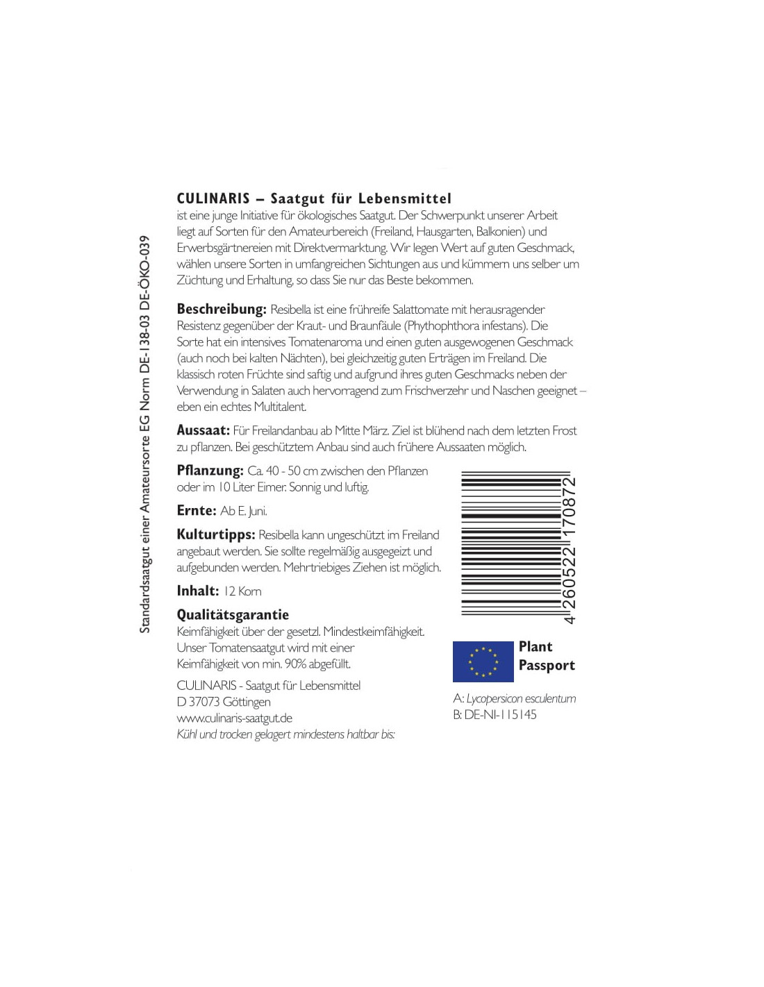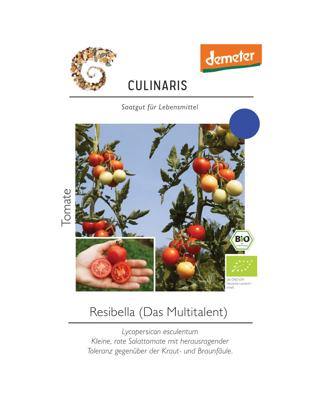 Resibella ist eine Salattomate mit herausragender Resistenz gegenüber der Kraut- und Braunfäule (Phythophthora infestans). Die Sorte hat ein intensives Tomatenaroma und einen guten ausgewogenen Geschmack (auch noch bei kalten Nächten), bei gleichzeitig guten Erträgen im Freiland. Die klassisch roten Früchte sind saftig und aufgrund ihres guten Geschmacks hervorragend zum Frischverzehr und Naschen geeignet. Die Sorte ist wüchsig, die Fruchtreife ist früh.