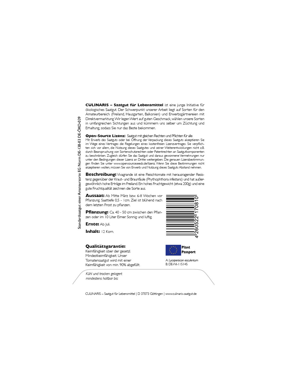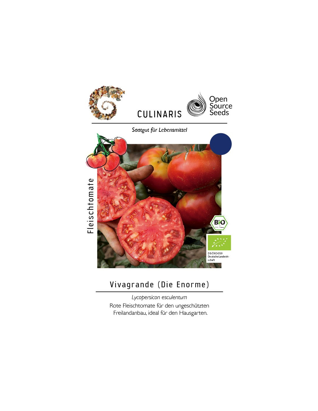 Vivagrande ist unsere erste Fleischtomate mit herausragender Resistenz gegenüber der Kraut- und Braunfäule (Phythophthora infestans). Die Sorte bringt außergewöhnlich hohe Erträge im Freiland und ist ein echtes Muss für alle, die Fleischtomaten im Freiland ernten wollen. Die roten Früchte haben ein Fruchtgewicht von etwa 200g und eine für Fleischtomaten auffallend gute Fruchtqualität. Der Geschmack ist angenehm mild und ausgewogen. Aufgrund der großen Früchte und des festen Fruchtfleisches ist Vivagrande eine hervorragende Kochtomate, von der sich auch größere Mengen schnell verarbeiten lassen. Die Pflanzen haben eine sehr geringe Wüchsigkeit und können daher unkompliziert im Kübel oder an niedrigeren Rankhilfen gezogen werden. Open-Source Lizenz: Saatgut mit gleichen Rechten und Pflichten für alle. Mit Erwerb des Saatguts oder bei Öffnung der Verpackung dieses Saatguts akzeptieren Sie im Wege eines Vertrages die Regelungen eines kostenfreien Lizenzvertrages. Sie verpflichten sich vor allem, die Nutzung dieses Saatgutes und seiner Weiterentwicklungen nicht z.B. durch Beanspruchung von Sortenschutzrechten oder Patentrechten an Saatgutkomponenten zu beschränken. Zugleich dürfen Sie das Saatgut und daraus gewonnene Vermehrungen nur unter den Bedingungen dieser Lizenz an Dritte weitergeben. Die genauen Lizenzbestimmungen finden Sie unter www.opensourceseeds.de/lizenz. Wenn Sie diese Bestimmungen nicht akzeptieren wollen, müssen Sie von Erwerb und Nutzung dieses Saatguts Abstand nehmen.