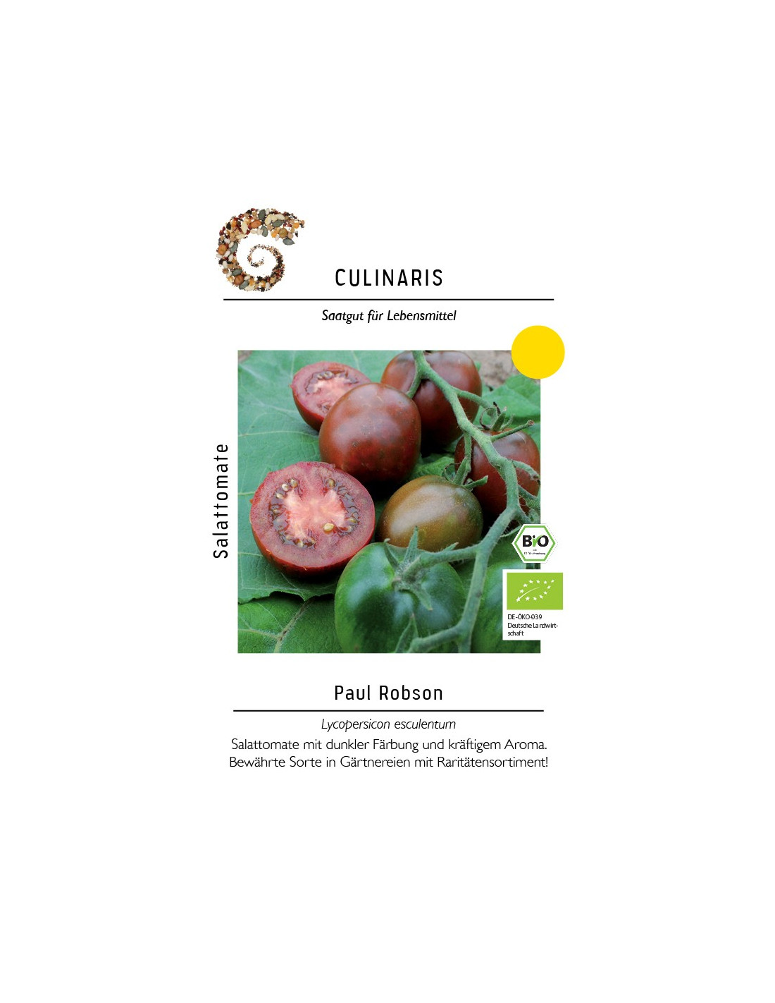 Paul Robson ist eine sehr dunkle Salattomate mit weichem Fruchtfleisch und einem ganz besonderen, kräftigen Aroma. Sie hat ein Fruchtgewicht von 105 g und eignet sich neben der Verwendung in Salaten für eine Kombination mit Mozzarella und Basilikum. Die Pflanze ist von guter Wüchsigkeit und eine bewährte Sorte in Gärtnereien mit einem Raritätensortiment. Sie sollte regelmäßig ausgegeizt und hochgebunden werden. Eine ausreichende Nährstoffversorgung erhöht den Ertrag. Unsere historischen Sorten wurden im "überdachten Feldanbau" bei niedrigem Düngeniveau und ohne zusätzliche Bewässerung auf Leistungsfähigkeit, Gesundheit und Geschmack selektiert.