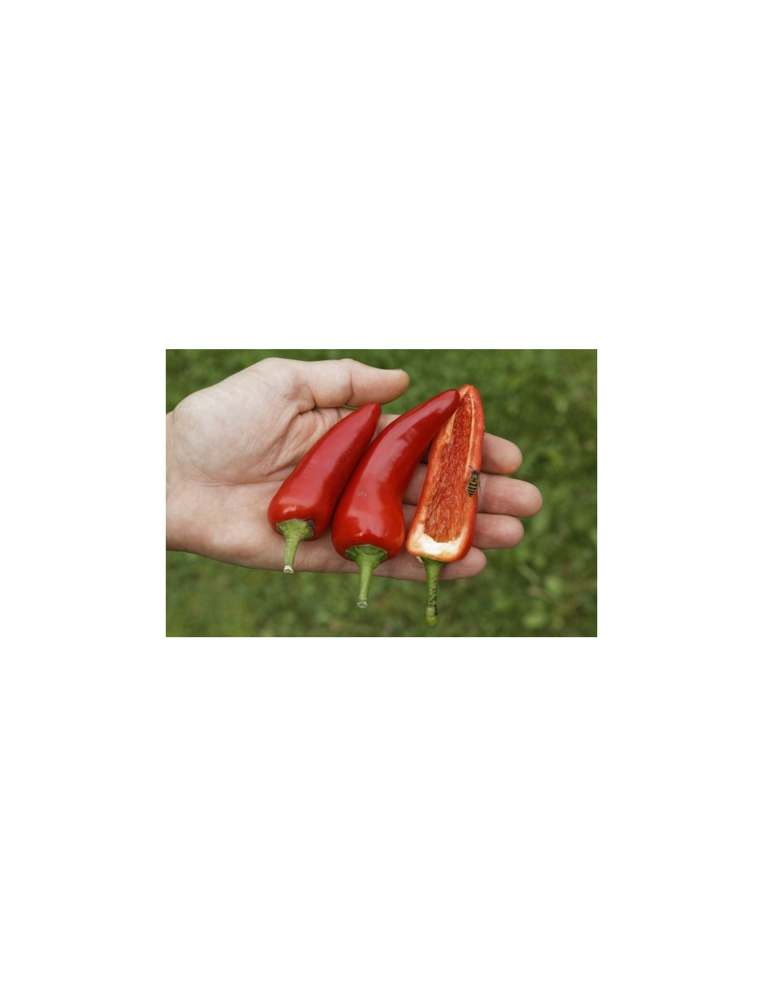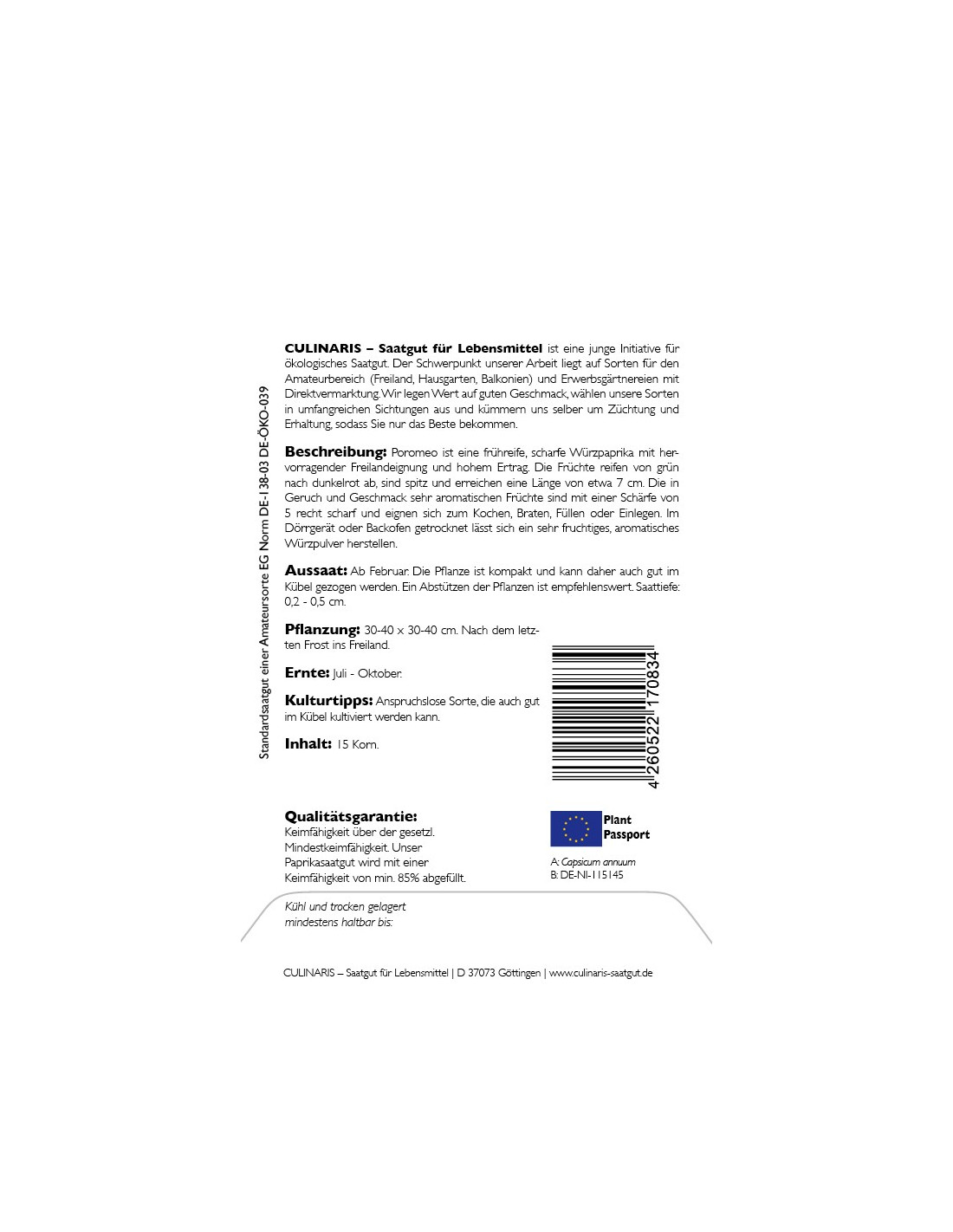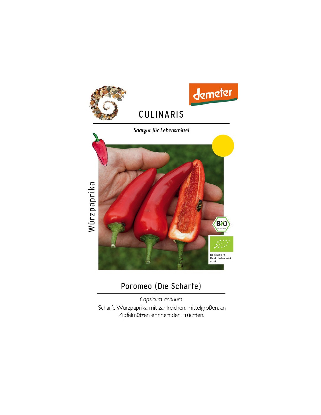 Poromeo ist eine frühreife, scharfe Würzpaprika mit hervorragender Freilandeignung und hohem Ertrag. Die Früchte reifen von grün nach dunkelrot ab, sind spitz und erreichen eine Länge von etwa 7 cm. Die in Geruch und Geschmack sehr aromatischen Früchte sind mit einer Schärfe von 5 recht scharf und eignen sich zum Kochen, Braten, Füllen oder Einlegen. Im Dörrgerät oder Backofen getrocknet lässt sich ein sehr fruchtiges, aromatisches Würzpulver herstellen. Die Pflanze ist kompakt und kann daher auch gut im Kübel gezogen werden. Ein Abstützen der Pflanzen ist empfehlenswert.