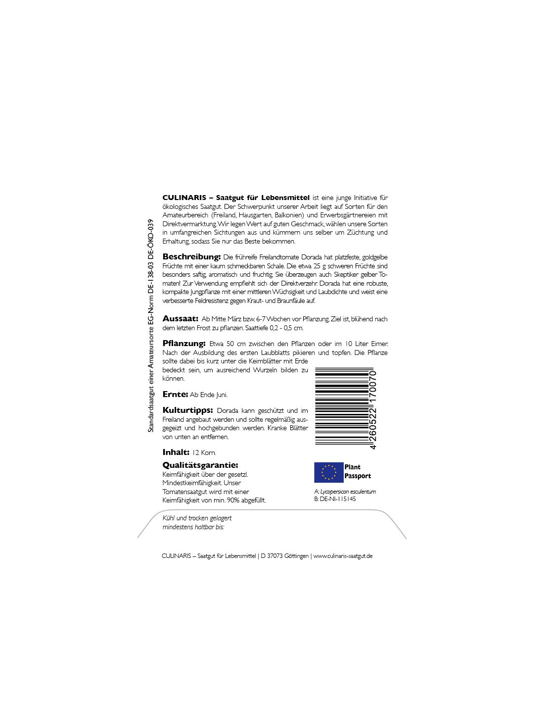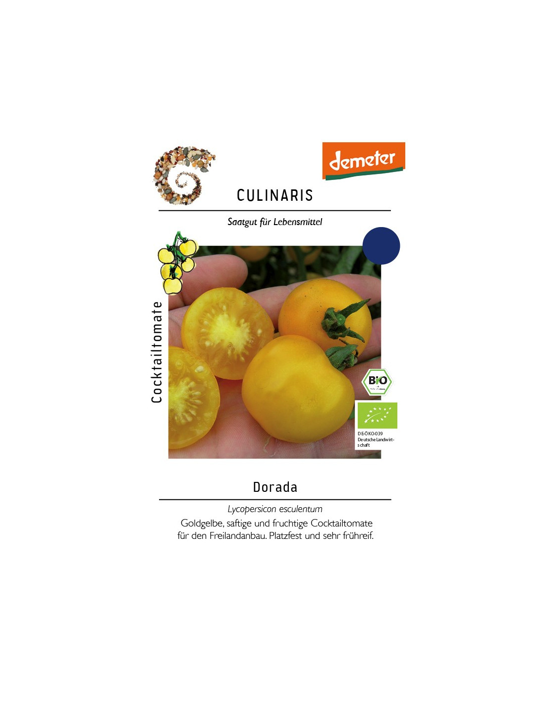 Die frühreife Freilandtomate Dorada hat platzfeste, goldgelbe Früchte mit einer kaum schmeckbaren Schale. Die etwa 25 g schweren Früchte sind besonders saftig, aromatisch und fruchtig. Sie überzeugen auch Skeptiker gelber Tomaten! Zur Verwendung empfiehlt sich der Direktverzehr. Dorada hat eine robuste, kompakte Jungpflanze mit einer mittleren Wüchsigkeit und Laubdichte und weist eine verbesserte Feldresistenz gegen Kraut- und Braunfäule auf. Sie eignet sich für den Freiland- und geschützten Anbau, sowie für den Anbau im Kübel. Man sollte sie regelmäßig ausgeizen und hochbinden. Eine ausreichende Nährstoffversorgung erhöht den Ertrag, aber Dorada ist auch bei reduzierter Düngung und Bewässerung leistungsfähig.