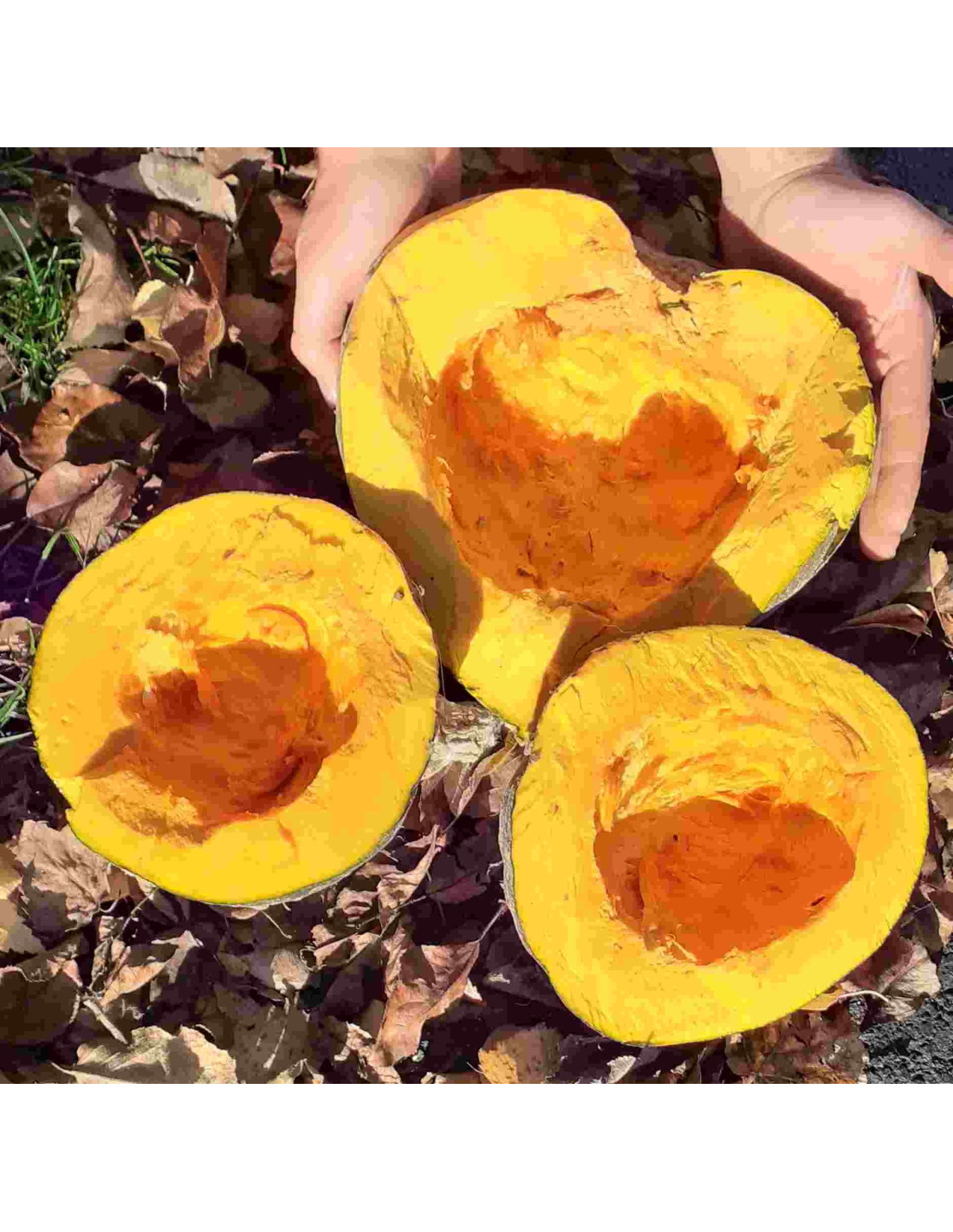 Hervorragender Speisekürbis mit orangefarbenem, festem, aromatischem Fruchtfleisch.