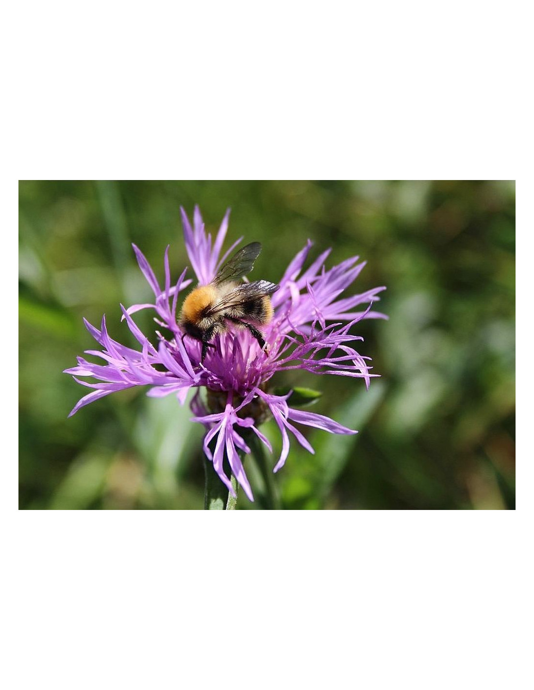 Der botanische Name Centaurea entspricht einer Heilpflanze des kräuterkundigen Zentauren Chiron ( der mit den heilenden Händen) in der griechischen Sagenwelt mit welcher der Zentaur eine Wunde am Fuß des Achilles geheilt haben soll. Die Flockenblume gehört zur Familie der Korbblütler was sie für viele heimische Insekten und Wildbienen so interessant macht. Jedes Körbchen besteht aus 60 bis 100 violetten Blüten. Die meisten Insekten wird man in den frühen Nachmittagsstunden beobachten können. Dazu gehören neben den Wildbienen auch Hummeln, viel Falterarten und Schwebfliegen.