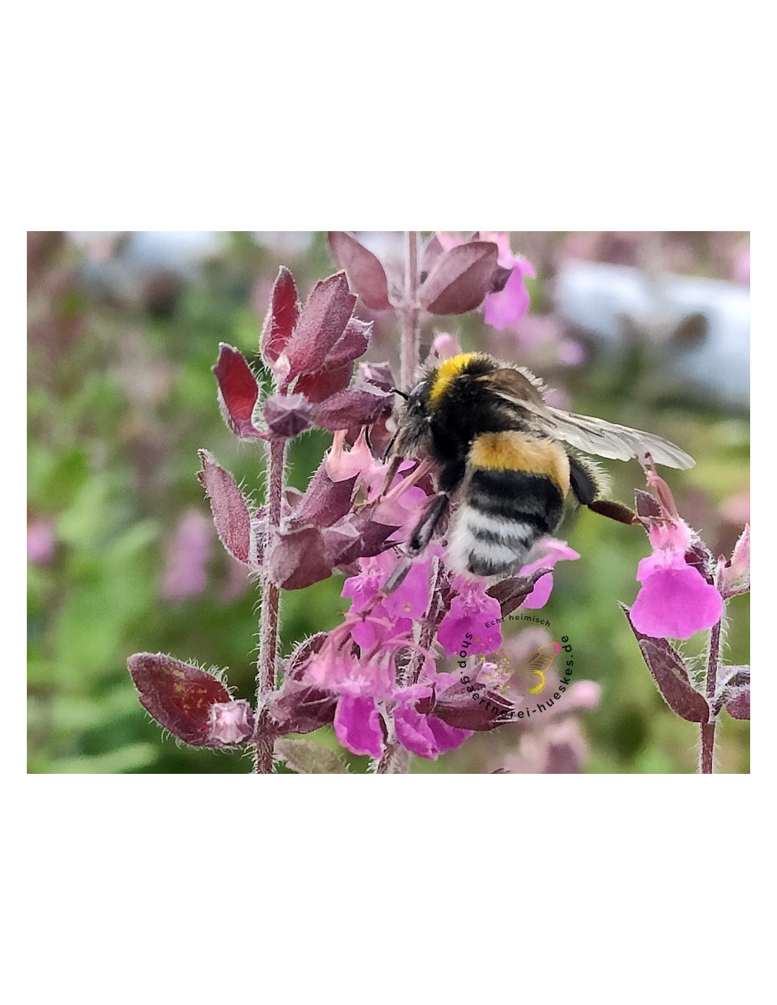 Edel-Gamander ist eine ausdauernde, winterharte Wildstaude mit rosafarbenen Lippenblüten und aromatisch duftendem Laub. Er eignet sich hervorragend für sonnige, trockene Gartenbereiche und Naturgärten. Durch seine lange Blütezeit von Juli bis September bietet er eine wertvolle Nahrungsquelle für zahlreiche Wildbienenarten und andere Bestäuber.