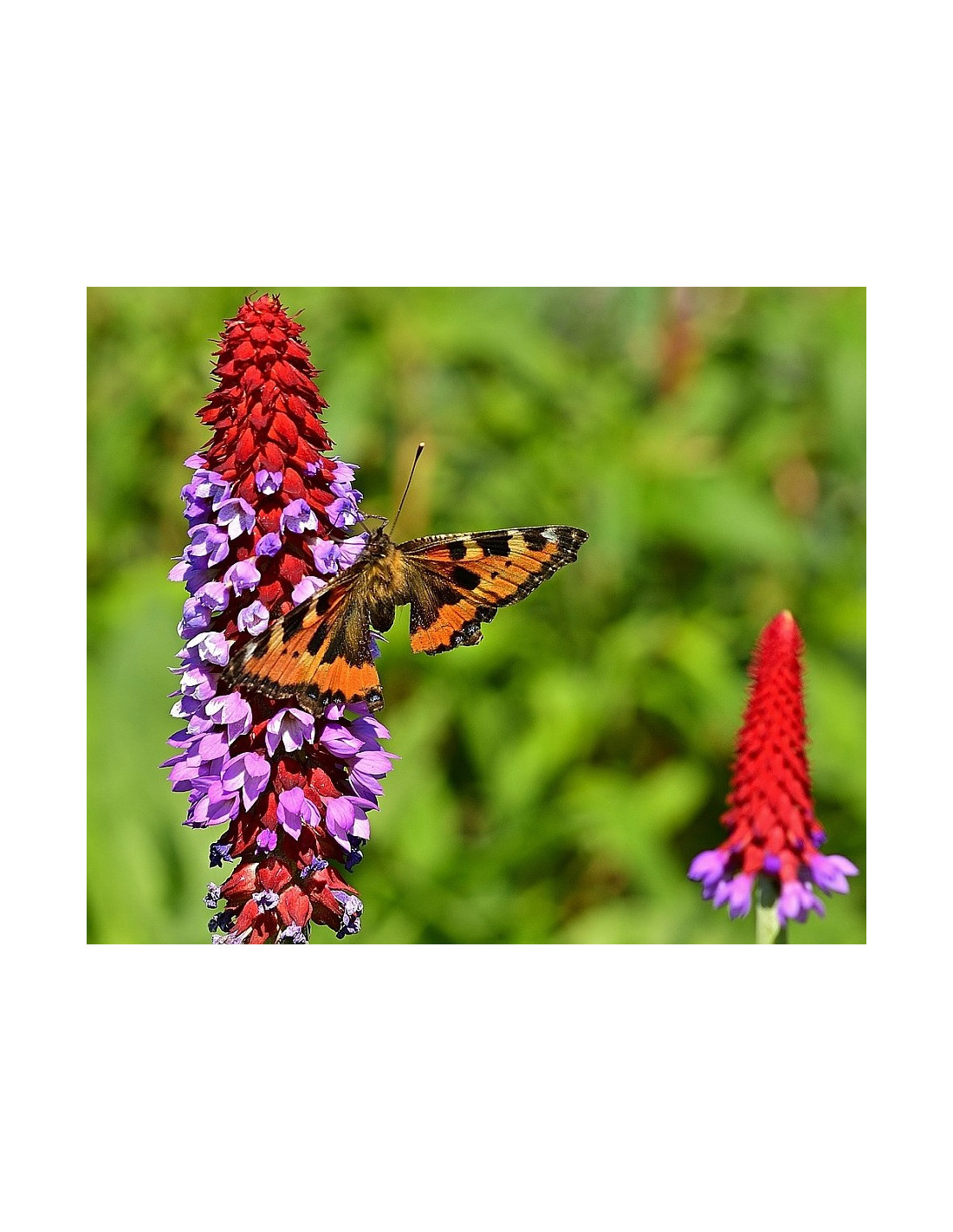 Die Orchideen-Primel 'Primula vialii' ist eine beeindruckende, jedoch nicht heimische Staude, die sich durch ihre ungewöhnlichen, konischen Blütenähren auszeichnet. Ihre röhrenförmigen Blüten erstrahlen im Juli in einem faszinierenden Farbspiel aus Blau-Purpur und Rot.